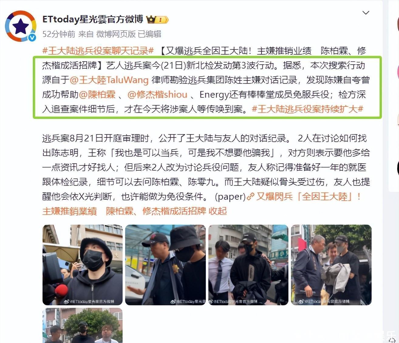 据悉,此次拘捕的“行动源”来自王大陆律师勘验逃兵集团陈姓主嫌对话记录,发现陈嫌自夸曾成功帮助陈柏霖、修杰楷以及张书伟免服兵役,检方深入追查细节之后,这才决定拘提以上三人。